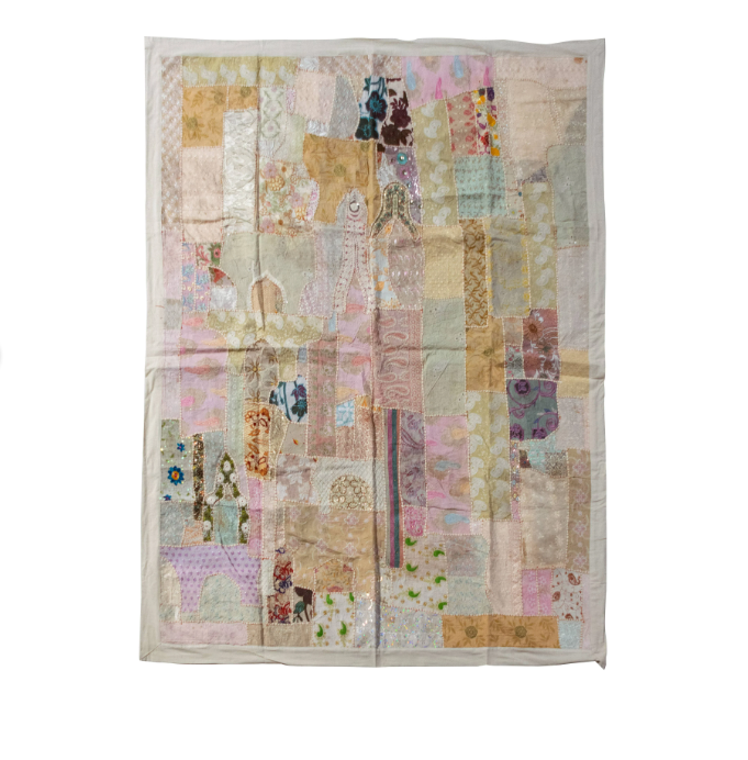 You will find so many uses for this “One of a Kind” Vintage Textile Quilt/Bed Cover. It is a functional piece of artwork and handcrafted to complement your home in any room. It was patiently hand-stitched and intricately hand-beaded. The back is the same solid color as the trim which determines the color name. Disclaimer: Please note that this item is vintage and its charm may reveal some imperfections that are the result of its long journey in life. You will not receive the one photographed. No two covers are the same. All colors and prints will vary, except the back and outer trim are consistent. Measurements will vary and are approximate. 75″W x 95″L