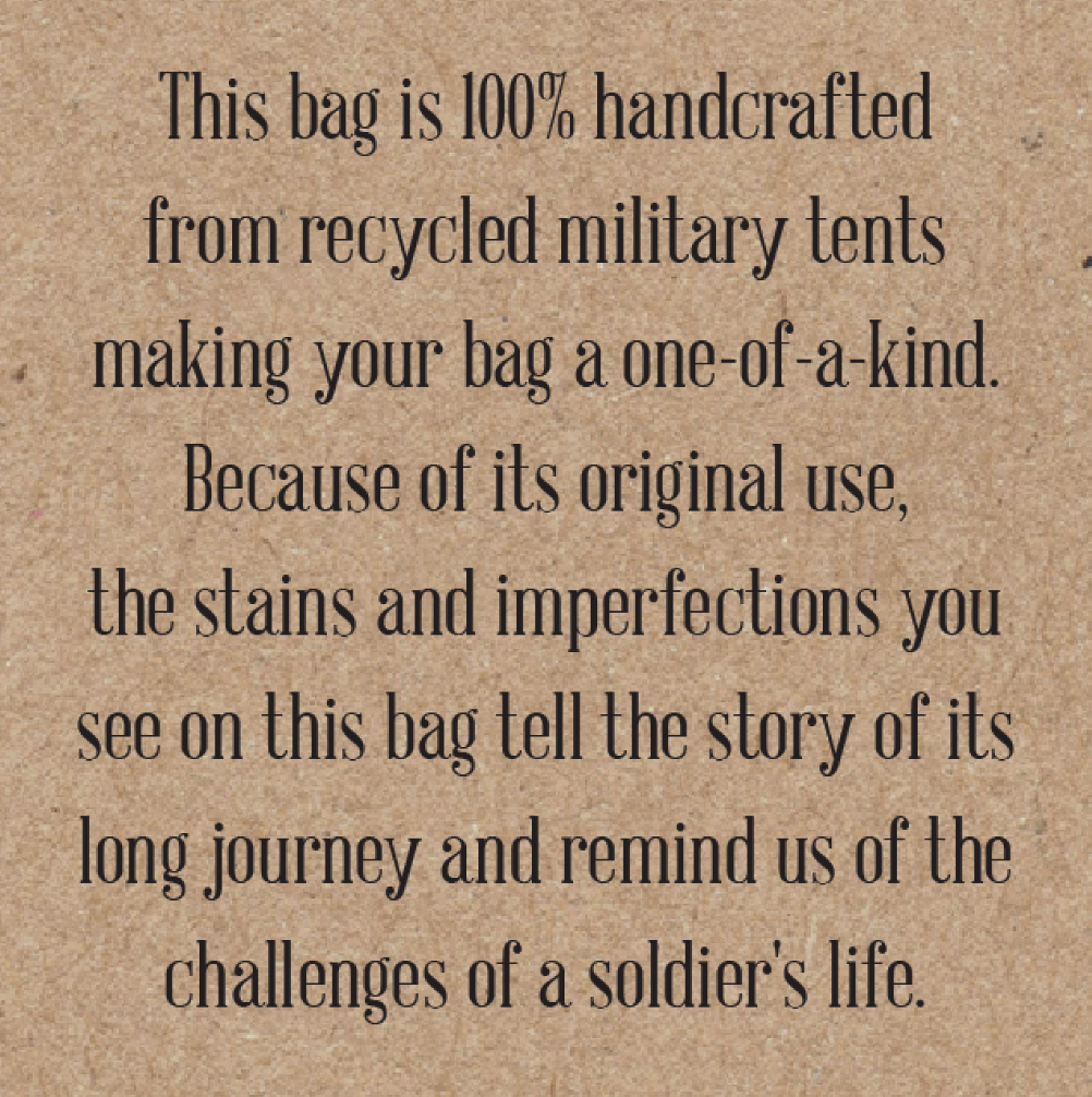 This Hand Chosen recycled military tent crossbody features decorative vintage fabric patchwork trim, a zipped top, 1 exterior front pocket with snap closure, an adjustable shoulder strap. DISCLAIMER: Our recycled military tent bags are a tribute to and a reminder of the sacrifices and contributions of military veterans. Please know that these bags are made from authentic used military tents and are not brand new canvas packaged as recycled tents or tarps. THESE ARE THE REAL DEAL!! As a result, the tent material will show signs of worn-like imperfections which add to its character. Each bag has differences in genuine imperfections, stains, and colors. Your bag will be as unique as each soldier’s experience when seeking shelter in these tents whether in the training field or in a combat zone. Also note, that the vintage textiles and fabrics used to embellish this style will vary in color and design from bag to bag. Vintage fabrics will vary from photo to photo- no two are the same.